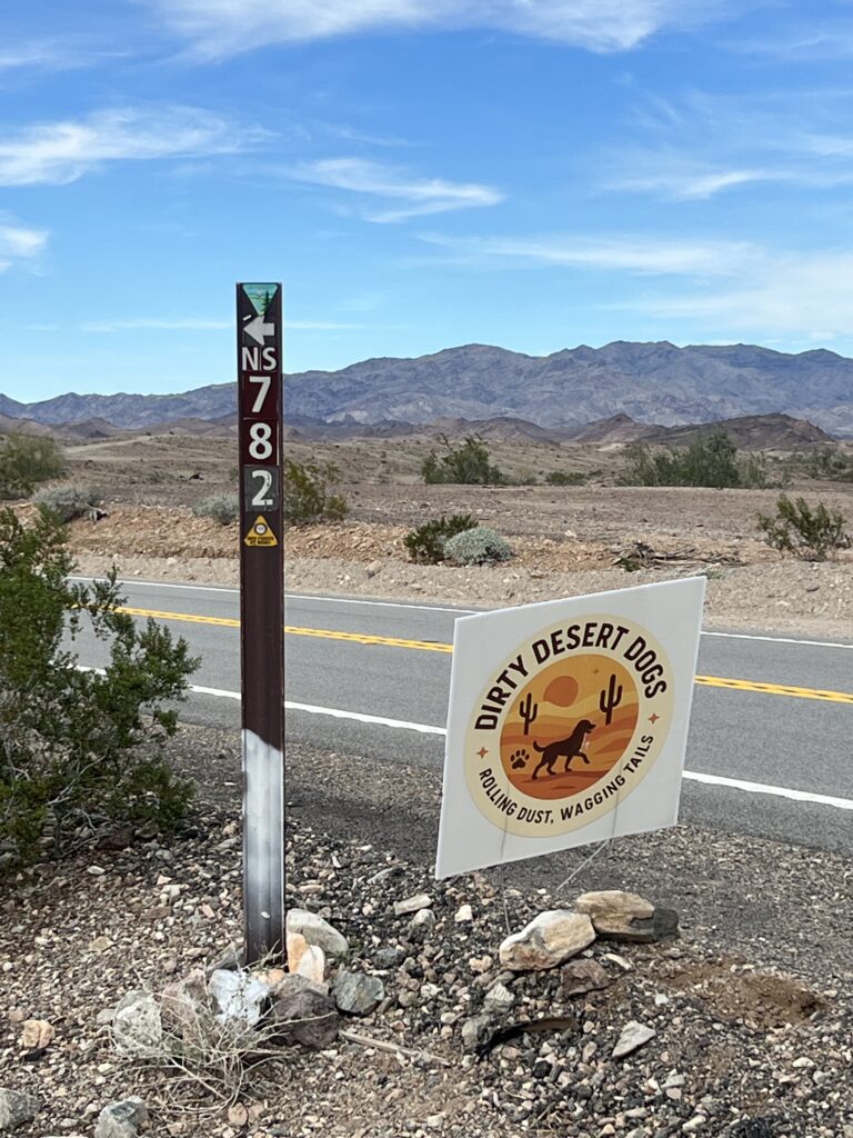 If approaching from the Parker Az side, you will see the #NS 782 post, and if still there, the sign for Dirty Desert Dog’s group. (Another great nomad group)