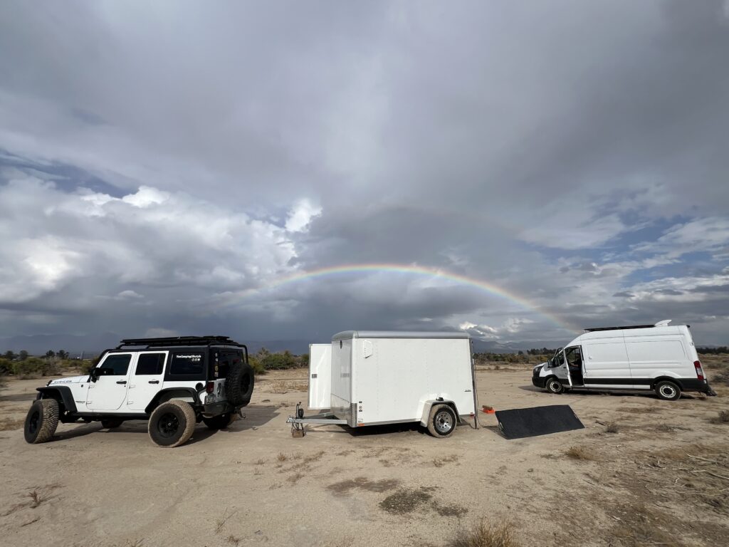 Here are Pete and Sandi’s set ups. Pete and Kitty are in the white Jeep towing the white cargo trailer, while Sandi resides in the white Ford Transit.